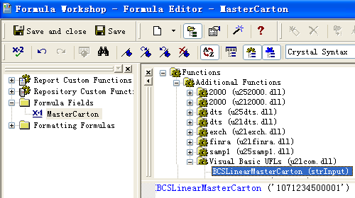 2. Click Functions ==> Additional Functions ==> UFL COM and .NET(u212com.dll), Cliquez "BCSLinearMasterCarton" fonction.