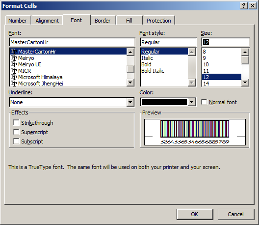 7. Right click Cell B1, choose Format Cell from context menu. Then click Font to apply one of the appropriate font typeface to the cell, such as Master Carton.